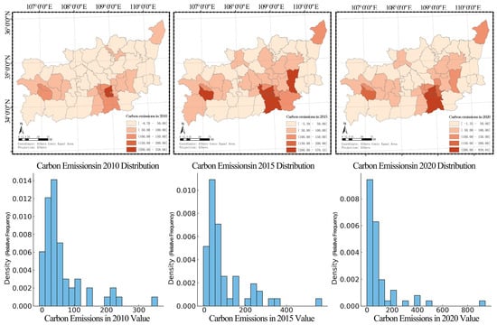Figure 8 delineates the spatiotemporal variations in carbon emissions across the Guanzhong urban agglomeration from 2010 to 2020. This graphical representation enhances the intuitive understanding of the dynamic trends in carbon emissions within the area, facilitating more effective analyses of their spatiotemporal evolution.