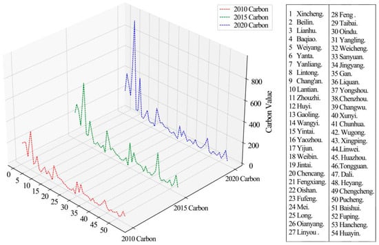 According to the data from the “China Statistical Yearbook 2022”, the study calculated the GDP energy consumption for the years 2010, 2015, and 2020 as 0.88, 0.72, and 0.55 (104 CNY/ton of standard coal), respectively. Utilizing the standard coal conversion coefficient method provided by the National Bureau of Statistics, a conversion factor of 0.68 (ton/ton of standard coal) was adopted for this research to represent the standard coal equivalent. Through the application of Equations (11)–(13), total carbon emissions attributable to land use in the Guanzhong urban agglomeration were determined to be 34.33 million tons for 2010, 52.08 million tons for 2015, and 55.85 million tons for 2020.