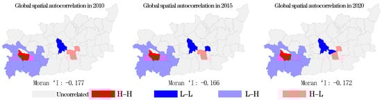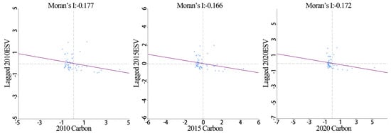 Analyzing the calculation results of the ESV and carbon emissions of the Guanzhong urban agglomeration, it is observed that the central area of the Guanzhong urban agglomeration, with the six districts of Xi’an as its core, has a high level of carbon emissions and a lower ESV. In contrast, the situation in the southwest region of Guanzhong is the opposite. This study will employ the bivariate spatial autocorrelation model to further analyze the spatial association and correlation between ESV and carbon emissions. From the bivariate global autocorrelation analysis for Guanzhong in the years 2010, 2015, and 2020, the Moran’s I indices were determined to be −0.177, −0.166, and −0.172, respectively (Figure 10). The p-values are 0.03, 0.05, and 0.02, respectively. This indicates that at a 95% confidence level, there is a pronounced negative spatial correlation between the carbon emissions and ESV of the various counties and districts in the Guanzhong urban agglomeration.