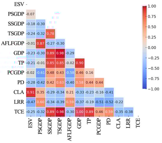 The ESV and carbon emissions of the Guanzhong urban agglomeration are influenced by a multitude of factors, including socio-economic aspects. To delve deeply into the dominant elements for precise energy-saving and emission-reduction initiatives, this study, drawing upon relevant research findings and emphasizing data’s scientific nature, precision, and accessibility, selected 12 statistical datasets from 2020 for various counties in Guanzhong. These datasets encompass the Ecosystem Service Value (ESV); Primary Sector Gross Domestic Product (PSGDP); Secondary Sector Gross Domestic Product (SSGDP); Tertiary Sector Gross Domestic Product (TSGDP); Gross Domestic Product from Agriculture, Forestry, Livestock, and Fisheries (AFLFGDP); Total Gross Domestic Product (GDP); Total Population (TP); Per Capita Gross Domestic Product (PCGDP); Population Density (PD); County Land Area (CLA); Land Reclamation Rate (LRR); and Total Carbon Emissions (TCE). An in-depth correlation analysis was conducted on these datasets, and the computed results were visually represented using a diagonal correlation coefficient matrix.
