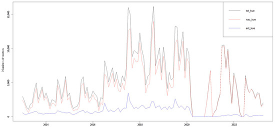 Figure 2 shows the behaviour of visits during the years 2013 and 2023. Visually, there is a significant increase in visits in 2017; while in 2020, a sharp drop is evident. The most striking aspect from 2020 onwards is that visits by foreigners are almost non-existent, and since then, the series has been composed mainly of national tourists.