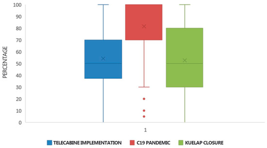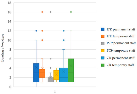 In each of the events studied, it was to be expected that people estimated the impacts and, consequently, developed strategies for hiring staff. Figure 4 shows the distribution of the number of workers for each of the events involved. Regarding permanent workers, an average of 4.2, 3 and 3.3 was observed for the economic impact of the implementation of cable cars [ITK], the COVID-19 pandemic [PC19] and closure of Kuélap [CK], respectively. On the other hand, the number of temporary workers corresponded to 3.9, 2.6 and 4.6 for ITK, PC19 and CK, respectively.