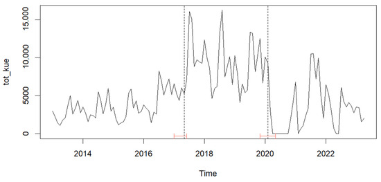 Figure 5 details the presence of structural breaks in the series analysed by means of the F-test. With a high significance (p-value = 0.000), it was estimated that the optimal partition occurred in three segments, i.e., through the presence of two structural breaks corresponding to May 2017 (i.e., January to June 2017) and February 2017 (i.e., November 2019 to May 2020).