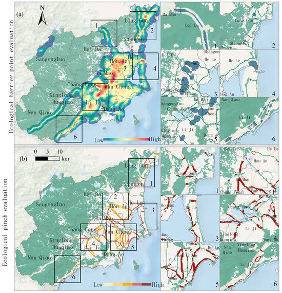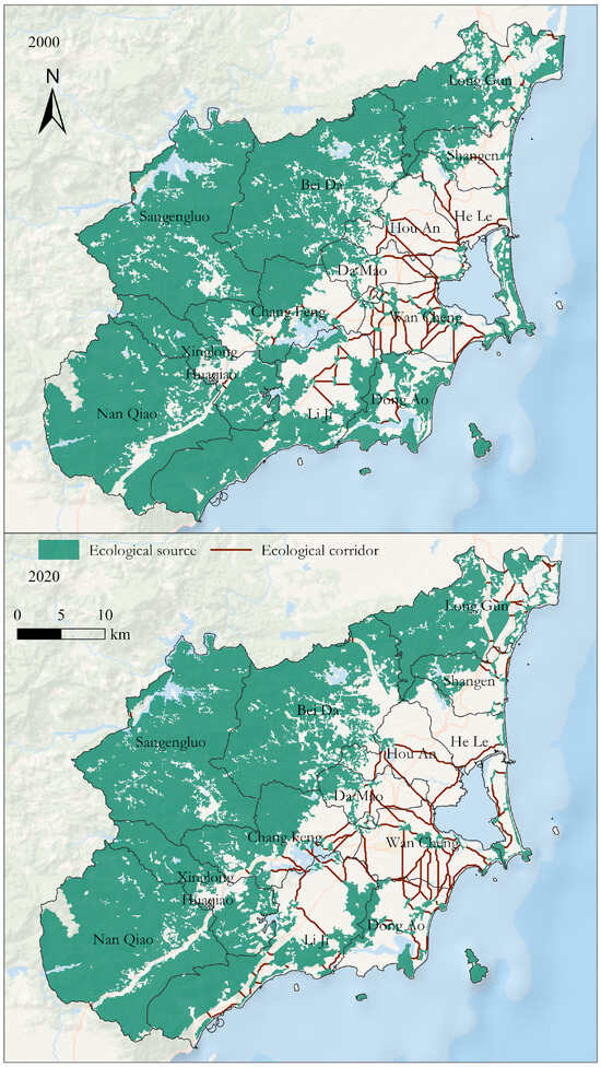 - The ecological source areas in Wanning City displayed notable regional variations, with higher concentrations found in the western and southern sectors, while the central and eastern regions exhibited fewer ecological source areas. The ecological corridors were predominantly located in the central and eastern parts of the city, with a less dense presence in the northern area. This divergence can be attributed to the prevalence of mountains and extensive forest and grassland in the eastern region, in contrast to the dominance of hills and plains, characterized by urbanization and human activities, in the central and western areas. This disparity highlights the substantial spatial heterogeneity within the ecological network.