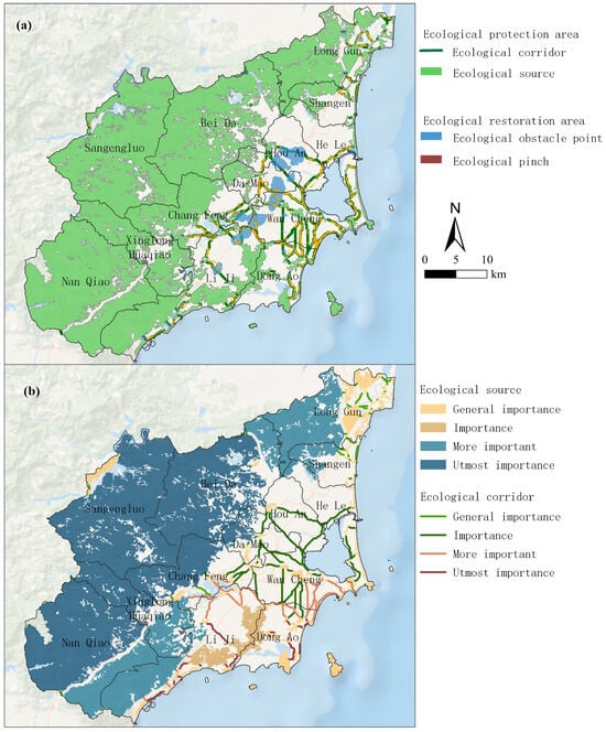 - To protect crucial ecological spaces and restore degraded and damaged areas, we propose an ecological network space protection and restoration plan, termed “one belt, four sources, eight districts, multiple corridors, and multiple points”. The restoration of territorial space will be focused on areas in Houan, Damao, Changfeng, and Liji. Emphasis will be placed on protecting and restoring ecological lands, such as forestland and grassland, in the north-central and eastern regions of the city to mitigate fragmentation. The goal is to enhance the connectivity of the landscape ecological network by increasing the number and size of ecological patches in regions like Wancheng, Damao, Dongao, and other central and eastern areas, while also restoring connectivity between ecological sources. Additionally, we aim to establish multiple ecological corridors and important ecological nodes based on reservoirs, wetlands, islands, and mountains, connected by the landscape of the Weiyu region. To ensure the protection and control of ecological resources, ecological protection spaces are classified into four levels: significant, relatively important, necessary, and generally essential, based on the importance of ecological source patches and the current centrality value of ecological corridors.