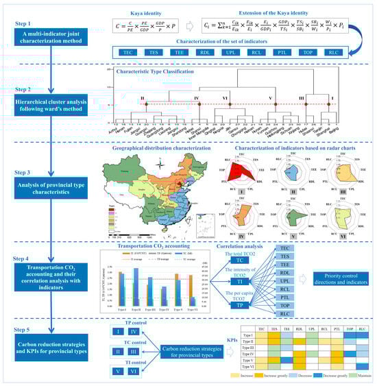 This study proposes a multi-indicator joint characterization method to construct evaluation indicators and typological categorization of inter-provincial TCO2 characteristics in China, aiming to establish carbon reduction strategies supporting provincial differentiation and regional collaboration. The methods used in this study can be divided into five steps: (1) a multi-indicator joint characterization method; (2) hierarchical cluster analysis following Ward’s method; (3) analysis of provincial type characteristics; (4) TCO2 accounting and their correlation analysis with indicators; (5) carbon reduction strategies and KPIs for provincial types. Figure 1 illustrates the procedures, methods, and contents for achieving the research objectives. The overall research framework adopted this approach to measure sub-national TCO2 characteristics, categorize types, and formulate carbon reduction strategies, which is applicable to studies of other countries and regions with similar needs and data sources for carbon reduction.