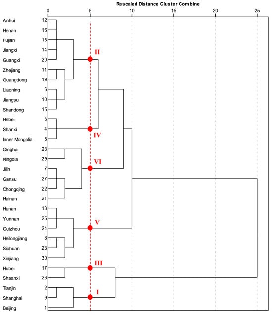 After calculating the nine characteristic indicators across thirty Chinese provinces in 2019, this study conducted standardization processing on the indicator values (i.e., defining maximum indicator values), so the value range of the characteristic indicators is [0, 2]. See Appendix A, Table A1. This study performed hierarchical cluster analysis with Ward’s method on the characteristic indicators across thirty provinces using SPSS Statistics 25 software to obtain the classification dendrogram of provinces and divided the thirty Chinese provinces into six types by the vertical line segmentation method (Figure 2).