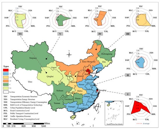 (1) Type I includes Beijing, Tianjin, and Shanghai, which are municipalities directly under the central government in China. They have high levels of economic development and urbanization, comprehensive infrastructure construction, and are the most densely populated areas in China. As shown in Figure 4, the advantageous characteristics of Type I are as follows: a high level of transportation technology R&D (RDL), which ranks the second highest among all types; the highest level of public transportation construction (PTL) among all types; and transportation energy consumption efficiency (TEE) reaching the provincial average. The disadvantageous characteristics are as follows: a relatively heavy transportation energy structure (TES), characterized by a lower share of clean transportation energy (ranked lowest among all types); high urban population density level (UPL), which is the highest among all types; high traffic operation pressure (TOP), which refers to the number of private cars and the degree of road congestion (ranked the highest among the types); high residents’ living consumption level (RLC), which is the highest among the types; relatively low road construction level (RCL), which is the lowest among the types; and low transportation economic structure (TEC), which ranks lowest among the types.
