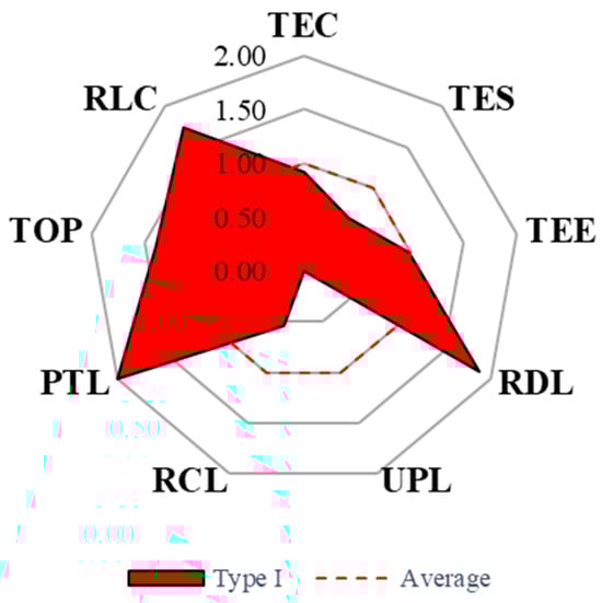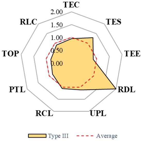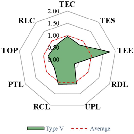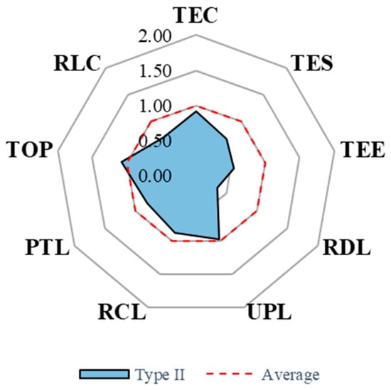 (2) Type II includes Liaoning, Jiangsu, Zhejiang, Anhui, Fujian, Jiangxi, Shandong, Henan, Guangdong, and Guangxi, mostly located in economically vibrant eastern coastal regions and adjacent coastal provinces in central China, with good geographical adjacency, high economic development, high urbanization levels, high population density, and complex and developed transportation networks. As shown in Figure 5, the advantageous characteristics are as follows: relatively low TEE indicator (2nd lowest among the types), UPL indicator reaching provincial average, and relatively low RLC indicator (2nd lowest among the types). The disadvantageous characteristics are as follows: low RDL indicator, relatively heavy TES indicator (2nd highest among the types), relatively low PTL indicator, high TOP indicator, relatively low RCL indicator (2nd lowest among the types), and the lowest TEC indicator among the types.