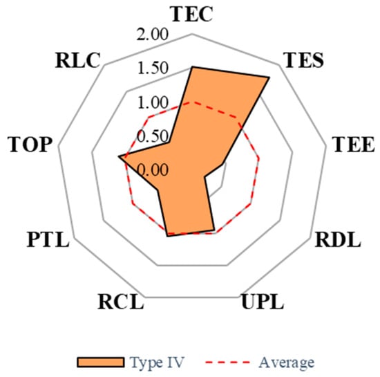 (4) Type IV includes Hebei, Shanxi, and Inner Mongolia, all located in northern China with good geographical adjacency. They are focused on heavy industry and energy production, have relatively lower economic development, abundant natural mineral resources, and are important coal production bases in China. As shown in Figure 7, the advantageous characteristics are as follows: the highest TEC indicator, the lightest TES indicator, and the lowest TEE indicator among the types. Additionally, there is a relatively low RLC indicator (ranked 1st among the types), and the RCL indicator reaches the provincial average. The disadvantageous characteristics are as follows: relatively low PTL indicator (ranked the lowest among the types), low RDL indicator (2nd lowest among the types), relatively high TOP and UPL indicators (2nd highest among the types).