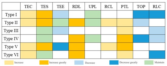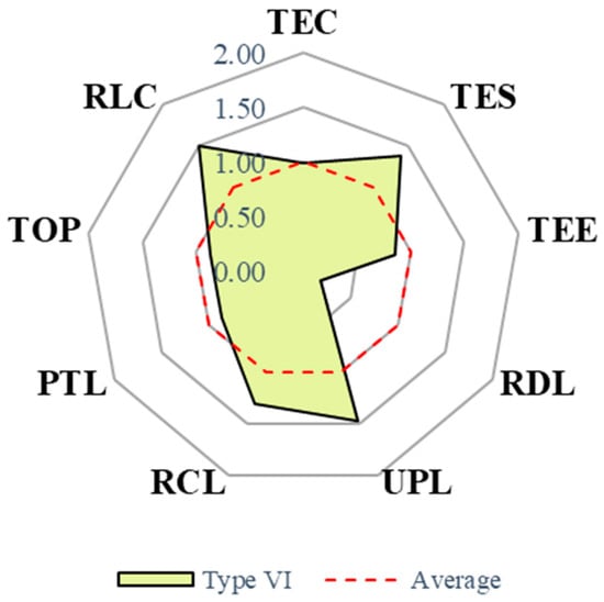 (6) Type VI includes Jilin, Hainan, Chongqing, Gansu, Qinghai, and Ningxia, primarily located in the western region of China, with the inclusion of provinces situated in specific geographical locations in the northeastern region (e.g., Jilin) and the eastern region (e.g., Hainan). These provinces have a large spatial span and poor geographical adjacency, varying levels of economic development and urbanization, relatively low economic output and growth rate, and are in the stage of actively promoting new urbanization. They possess abundant natural and cultural tourism resources, with Gansu and Qinghai being important new energy bases in China. As shown in Figure 9, the advantageous characteristics are as follows: the highest RCL indicator and the lowest UPL indicators among the types; the TEC indicator reaches the provincial average, ranking as the second highest among the types. Additionally, it exhibits a relatively light TES indicator, which is also the second highest among the types. Moreover, this type shows relatively low TEE and TOP indicators. The disadvantageous characteristics are as follows: the lowest RDL indicator among the types, a relatively low PTL indicator, and a high RLC indicator (2nd highest among the types).