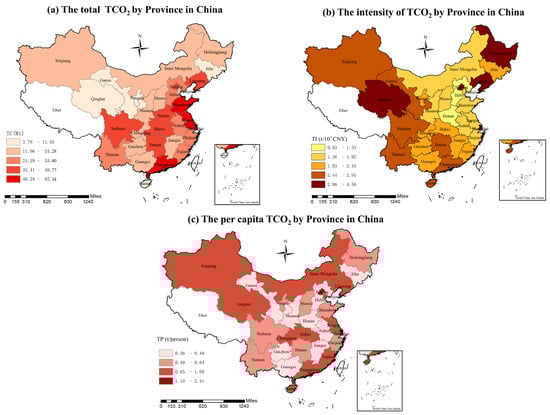 To ensure the convenience and accuracy of calculations, this study is based on the IPCC guidelines [50] and the research of Shan et al. [51] for TCO2 calculations. TC from the transportation sector is the sum of direct CO2 emissions from fossil energy consumption in the transportation sector (not including indirect emissions from electricity consumption) and CO2 emissions from gasoline and diesel consumption related to residential life. TI is the ratio of TC to the value-added of the transportation sector. TP is the ratio of TC to the year-end population of the province.