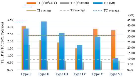 For TC of the types, Type I accounted for 37.15 Mt, Type II accounted for 43.47 Mt, Type III accounted for 33.06 Mt, Type IV accounted for 22.41 Mt, Type V accounted for 29.89 Mt, and Type VI accounted for 10.49 Mt, with a provincial average of 30.73 Mt. For TI of the types, Type I accounted for 3.05 t/104 CNY, Type II accounted for 2.07 t/104 CNY, Type III accounted for 1.91 t/104 CNY, Type IV accounted for 1.53 t/104 CNY, Type V accounted for 2.88 t/104 CNY, and Type VI accounted for 2.76 t/104 CNY, with a provincial average of 2.41 t/104 CNY. For TP of the types, Type I accounted for 1.71 t/person, Type II accounted for 0.63 t/person, Type III accounted for 0.64 t/person, Type IV accounted for 0.56 t/person, Type V accounted for 0.63 t/person, and Type VI accounted for 0.64 t/person, with a provincial average of 0.73 t/person. See Figure 10 and Figure 11 and Table 3 for details.