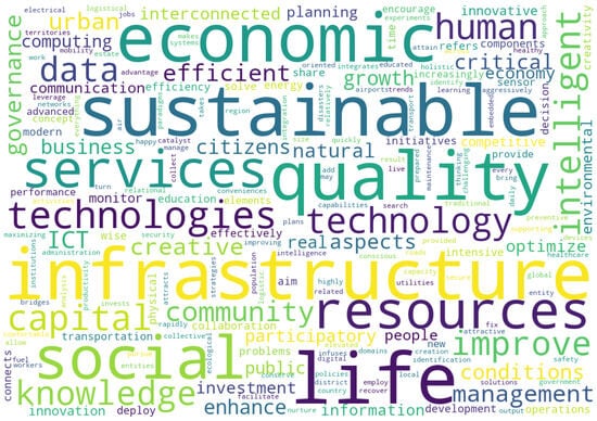 From assessing the various definitions of smart cities, it is observed that the definition of a smart city is dynamic, that is, dependent on global issues such as networking, ICT and sustainability. With the development of autonomous technologies, the modern definition is shifted to full autonomous services for citizens and combines previous definitions. In order to comprehend the modern definition of smart cities, an analysis of previous definitions is necessary. Therefore, a word cloud was generated with Python to analyze in detail the definition of a smart city.