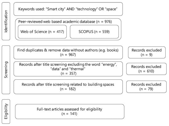 The search protocol was based on the search method in the previous section. It was used in two web-based peer-reviewed academic journal archives, i.e., Web of Science and SCOPUS, and the search was limited to between 2017 and 2022. The search words used were ‘smart city’, ‘technology’ and ‘space’ and were used with the Boolean operators ‘AND’ and ‘OR’. The search yielded 976 papers from both sources, where 417 and 559 papers were found from Web of Science and SCOPUS, respectively. From the combined papers, duplicates and papers without specific authors were excluded, leaving 967 papers. Due to the wide search area, papers that were not related to space and buildings were also included. Papers relating to other aspects of a smart city such as energy, data and thermal networks were excluded. As the search word included ‘space’, it included papers relating to cosmic space and also molecular spaces. Identification of these papers was performed by analyzing titles, keywords and abstracts, leading to 610 papers being excluded. The 357 papers that remained were screened again only using the title to focus on building spaces, leading to 175 records being excluded. With the remaining 182 papers, the full papers were searched online, as only papers where the full article is available are deemed eligible. Conclusively, after the filtering and screening process, 141 papers were left to be analyzed.