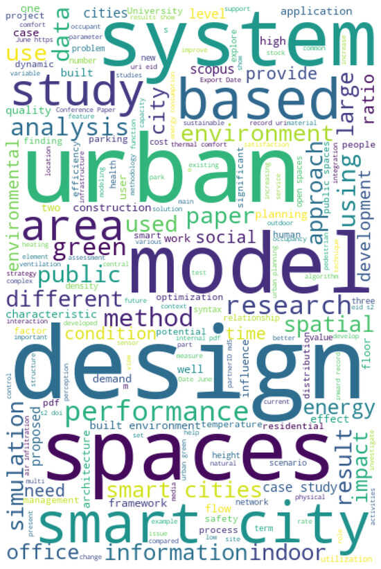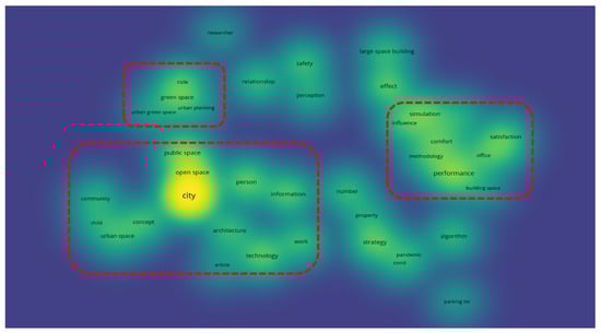 Figure 6 shows a density map of the words extracted from the titles, keywords and abstracts of the 141 eligible records. It shows that urban, public and open spaces are related to cities, focusing on people and urban areas using technology, information and architecture. According to the map, performance is focused on the business areas of building management and offices, where simulations are used to increase comfort and satisfaction.