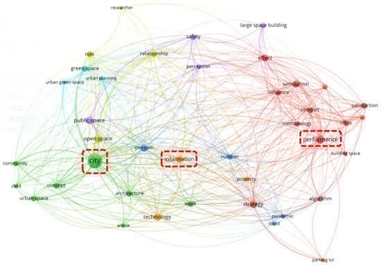 Figure 4 shows a network visualization of the same text that was used to create the word cloud. The keywords that are related most to other words were identified as city, information and performance. The network visualization shows that research conducted with city spaces as the main topic of study is mainly concerned with smart cities. It also shows that research was mainly focused on providing information and analyzing performance. These main keywords are colored to show words that are linked to the keywords. The word ‘city’ is shown to be linked with other words such as concept, urban space, architecture and community. This shows that research concerning a city is connected to concept design of an urban space, which is closely linked to architecture. The word information is colored to link with the word technology. This shows that technology is used to extract information about the city. Performance is linked to a vast amount of words such as comfort, simulation, building space, office and satisfaction as shown by red dotted square. This shows that the word ‘performance’ is linked closely to the efficiency and management of a space for a particular usage, such as offices.
