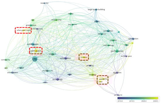 Figure 5 shows the overlay visualization from the 141 eligible records using VOSviewer 1.6 software. The overlay visualization shows the keywords according to date of publication. The legend shows purple to yellow colors that show the date of publication. Purple shows records published prior to 2019 and the yellow shows records that were published in 2021. The words ‘pandemic’ and ‘COVID’ are colored yellow, shown on the far-right side of the legend, representing latest articles, reflecting the response to the COVID-19 pandemic, with results beginning to appear in 2020. Other networks that are colored yellow show recent research areas of interest, which are open space and urban green space. On the other hand, words related to technology and information are colored purple to represent research conducted before 2019. The words that are frequently linked with other topics has been highlighted by a dotted red square.