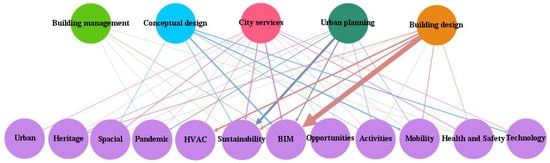 A visualization to organize the papers was performed using GEPHI 0.10 open-source graphing software. A total of 141 journal papers were found and have been identified as soft and hard methods of research, and were initially categorized based on future planning engineering approaches. In order to determine the research direction, i.e., the research trends, papers were further categorized based on architectural trends and the smart city index. This is shown in Figure 7, where topics are highlighted within the categorized papers. Studies relating to design and planning were found to be the majority. It was also identified that studies relating to design were focused on simulations and analyses related to the use of BIM. Sustainability was the second most studied topic, linked to the planning and application of technologies, and the urban category contained the least amount of studies.