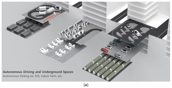 Studies that applied developing concepts and technologies were focused on smart city applications and evaluated their effects. The majority of the studies applied developing technologies, such as digital twins, augmented reality and other media-related technologies, with the purpose of improving management and the construction environment and digitizing smart cities [119,120,121,122,123]. Research relating to adaptation of hardware, according to fourth industrial revolution, has been performed, including service-providing sensors, signaling, navigation systems for specific environments and system development for connected intelligence spaces [124,125,126,127]. Case studies were performed that considered technological adaptations for public spaces within smart cities to benefit residents’ health, social interactions and safety [128,129].