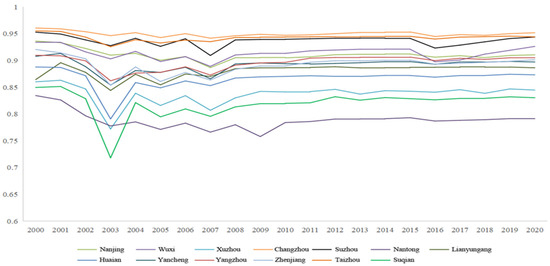 According to the calculation results of the Stata 15.0 software, the grain technical efficiency curve of each city in Jiangsu Province was drawn, as shown in Figure 1.
