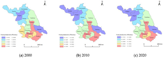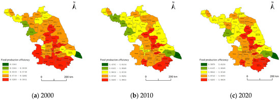 Spatial distribution of grain production efficiency in Jiangsu Province in 2000, 2010, and 2020 (city level).