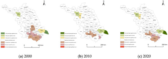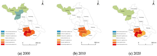 Evolution of cold hot spots in grain production in Jiangsu Province in 2000, 2010, and 2020 (city level).