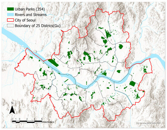 The need for sustainable urban development has been highlighted following major issues such as the increase in population and residential density, the exacerbation of urban shrinkage and spatial-social inequalities, the occurrence of urban heat islands and urban floods, and the rise in carbon emissions in cities. Considering that sustainable development aims to find and maintain a balance between economic development, environmental protection, and social well-being, green spaces in cities are important for manifesting such goals [1]. The way of securing, utilizing, and managing green spaces can ultimately contribute to the progress toward sustainable cities by enabling the securing of new stimuli for growth based on green economy, preserving biodiversity and responding to climate change, and improving the quality of life for urban residents. As public facilities and major components of green infrastructure, urban parks not only preserve natural landscapes and provide ecosystem services but also promote the physical and mental health of residents and strengthen social cohesion through exercise, leisure, recreation, and social activities [2,3,4,5,6,7,8,9,10].