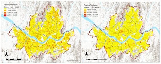 Floating population at night (00:00~06:00) and during the day (11:00~14:00) in 100 m × 100 m.