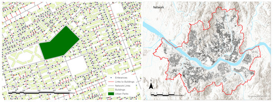 The catchment areas were calculated through actual distances traveled based on road networks rather than simple radii distances from the central point of each park. The road centerlines from the road name address system were utilized in constituting the networks. The road network information for accessing any building is organized as geographic information system (GIS) data because South Korea operates an address system based on road names and building numbers in order to resolve issues of the previous lot number address system. The road name address map reflects this new system and provides information such as legal districts, buildings, and entrances [24]. Connecting lines are established between the entrance of any building and roads in the network formed, enabling the precise calculation of the distances traveled (Figure 3). In the new system, each road section is classified into “-daero” for roads with eight or more lanes, “-ro” for those with two to seven lanes, and “-gil” for narrower roads. We reckoned that the latter represent the paths traveled by pedestrians and derived urban park catchment areas utilizing the network analysis function in the GIS (ArcGIS Pro 3.1) after establishing a walking network for Seoul as a whole [25].