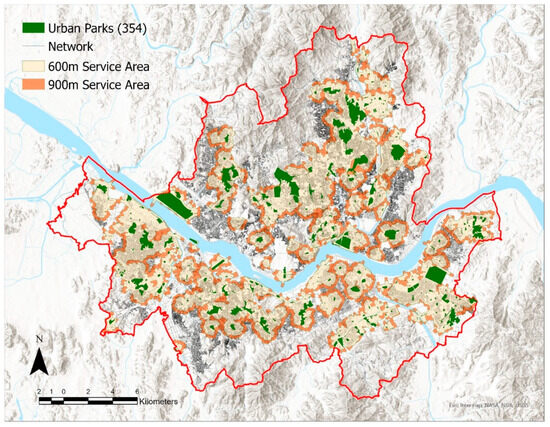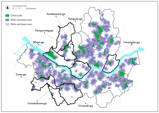This study analyzed the adequacy of the spatial locations of urban parks by calculating urban park catchment areas within walking distances of 600 m and 900 m, in the context of the 15-minute city. The park catchment area is the space between points that can be reached by walking either 600 m or 900 m departing from each park. It may include potential users of the urban park as well as buildings and other urban spaces. We classified reasonable periods of walking to urban parks in everyday life as 10 and 15 min and assumed the average walking speed of a person to be 1 m per second. Each was then converted into the walking distances of 600 m and 900 m.