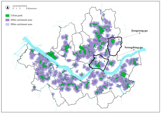 Urban parks and their 600 m and 900 m catchment areas in Seoul.