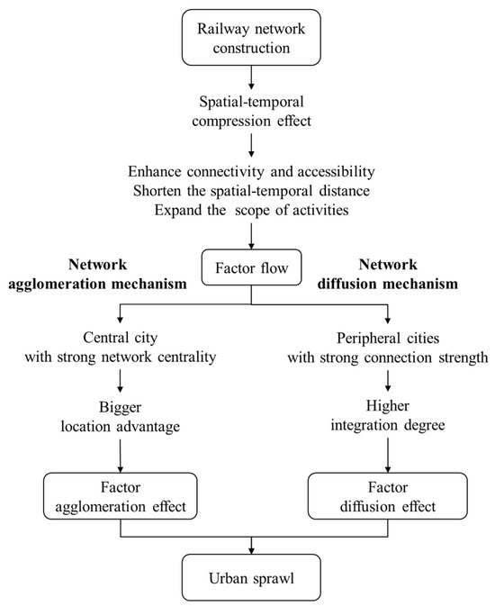 (1) Railway network construction has a significant positive impact on urban sprawl. Under the spatiotemporal effect, the railway network promotes the spatial flow of resources and factors. Under agglomeration and diffusion forces, resources and factors concentrate in central cities, and, at some stage, they diffuse from the central cities to the peripheral cities, which gives rise to the network agglomeration mechanism and network diffusion mechanism of urban sprawl.