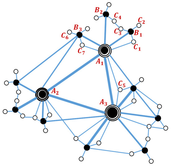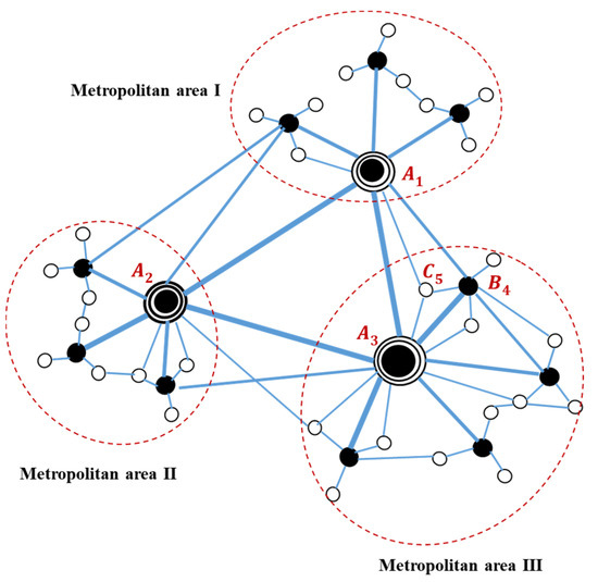 The degree of network integration reflects the status of cities in metropolitan areas in terms of infrastructure interconnection, industry convergence, market integration, resource and factor sharing, and cooperation across administrative boundaries. Figure 3 shows the different degrees of integration of peripheral cities with the central city. denotes the central city, denotes a secondary central city, and is a peripheral city.
