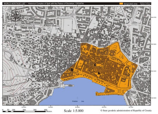- UNESCO—Historical complex of Split with the Palace of Diocletian. Maps: https://whc.unesco.org/en/list/97/maps/ (accessed on 3 July 2023): Figure 2.