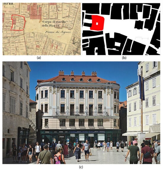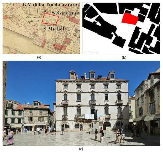 Collage of images of Nakić Palace. (a) Cadastral plan from 1831. The dotted red line marks the position of Nakić Palace. (b) Site plan of Nakić Palace, marked in red, within today’s urban tissue of the city of Split. (c) Contemporary photograph of the palace.