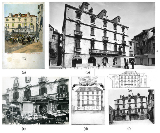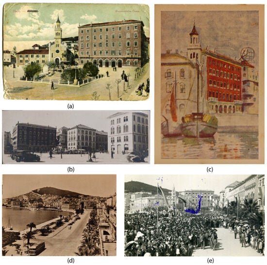 Consequently, we can read exactly these values in all three of the structures analysed above. The coherent communication between the façade and the spatial context, which was achieved precisely through active critical and creative expression resulting from adaptation and sensitivity towards the micro-context in all three examples, is proof of a rational balance between the architectural and stylistic patterns and the priorities derived from a concrete reading of the space. These interwoven city-building values ensured that these houses played an active role as bearers of cultural identity throughout the following centuries, despite a series of changes in their function and manner of use. It could be claimed that it was precisely because of these values that the structures retained and developed their significance. The relationship between open city spaces—squares and the main façades of the buildings analysed here—is the factor that sets them apart from other buildings from their period. Through this dialogue, they became a backdrop of city life. This is confirmed by the fact that their urban and architectural appearance has become instantly recognisable, a symbol of the city. They became a frequent and unavoidable motif on postcards, and with their various advertising and social inscriptions and messages, which were “glued” to their main façades, they were in constant communication with Split’s citizens.