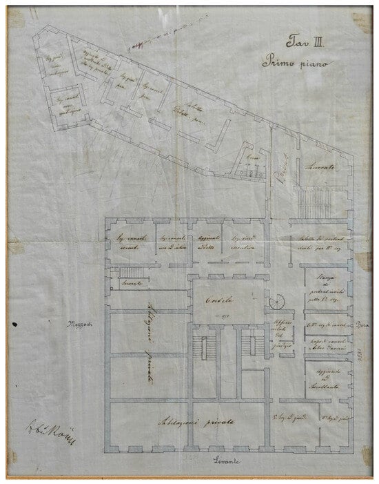 Plan of the first floor (primo piano) of Bajamonti Palace, with plans for the expansion of the new wing towards the west, which was never built.