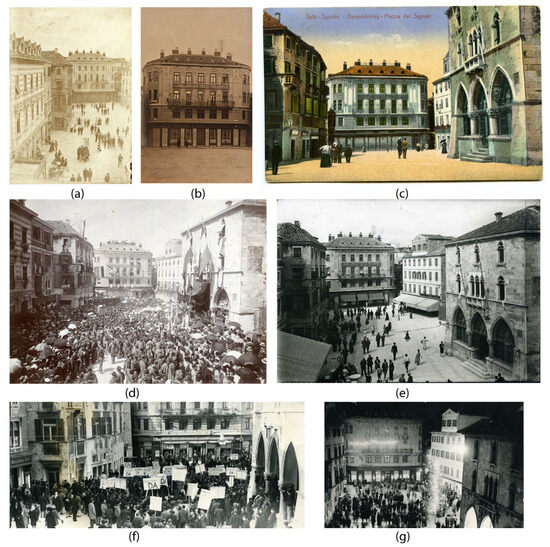 Collage of images illustrating the role of Nakić Palace in the urbanscape of the city of Split throughout history: (a) photograph c. 1905, (b) photograph c. 1910, (c) postcard c.1910, (d) photograph c. 1910, (e) photograph c. 1930, (f) photograph c. 1967, (g) photograph c. 1960 at Christmastime.