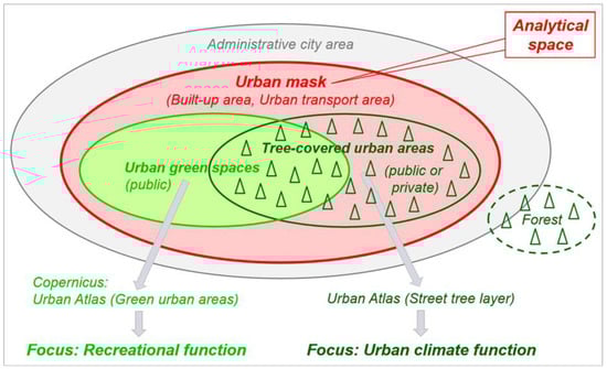 In this sense, the mapping guide of the Copernicus Urban Atlas defines which public urban green spaces are to be mapped as “Green urban areas” and in which geometric constellation [21] (p. 32). Such areas are dominated by vegetation with some tree cover. In contrast, public and private tree-covered urban areas are mapped as an additional layer to the Urban Atlas—the so-called “Street Tree Layer” (STL) [21] (p. 13). Figure 1 shows the different components of urban green infrastructure and their spatial overlapping in relation to the urban mask. The focus of the analysis is directed towards the two spatial UGS components mentioned above, mainly, representing the recreational function (land use) and the climate function (land cover). Due to their classification as natural and semi-natural areas in the Urban Atlas, forests are not assigned here to the urban mask but rather to open space, independently of their location inside or outside the administrative city area.