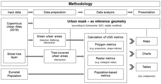 Figure 2 gives an overview of this study’s methodology: from the input data to data preparation and analysis up to the presentation of the results. The urban mask derived from Copernicus data is central to the spatial or geometric relationships and the calculated city-wide UGS metrics (including correlation). The additional exemplary investigations using two German data sources are not shown in the figure.