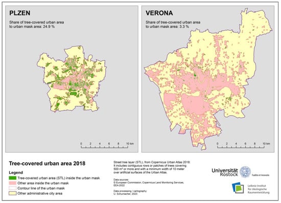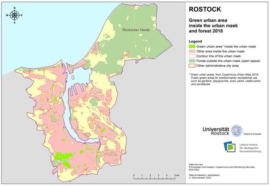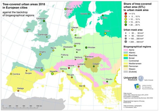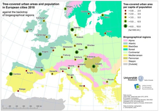 The data presented in this study are openly available in Copernicus Land Monitoring Services (CLMS): Urban Atlas 2018. Available online: https://land.copernicus.eu/local/urban-atlas/urban-atlas-2018 (accessed on 2 June 2022); Copernicus Land Monitoring Services (CLMS): Street Tree Layer 2018. Available online: https://land.copernicus.eu/local/urban-atlas/street-tree-layer-stl-2018 (accessed on 1 July 2022); European Environment Agency (EEA): Biogeographical regions in Europe. Available online: https://www.eea.europa.eu/data-and-maps/data/biogeographical-regions-europe-3 (accessed on 2 September 2022); Eurostat: Population on 1 January by age groups and sex—cities and greater cities. Available online: https://ec.europa.eu/eurostat/web/products-datasets/-/urb_cpop1 (accessed on 6 April 2023); Leibniz-Institut für ökologische Raumentwicklung (IÖR): Urban Green Raster Germany 2018. Zenodo, 2022. Available online: https://doi.org/10.26084/ioerfdz-r10-urbgrn2018 (accessed on 29 September 2022); Hanse-und Universitätsstadt Rostock: OpenData.HRO. Bäume des Baumkatasters Rostock. Available online: https://www.opendata-hro.de/dataset/baeume (accessed on 6 January 2023).