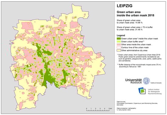 In Central Europe, the city of Leipzig, Germany, is characterised by a high number of large public urban green spaces (Figure 5). The share of green urban area within the urban mask is 14.96%. When including the potential microclimatic influence zones (+75 m buffer), this share more than doubles to 31.46%. Extensive parks, sports facilities and a zoological garden are located at the heart of a large alluvial forest, which stretches through the city from south to northwest. These green surfaces inside the urban mask run smoothly into the forest in the open space. Therefore, the delineation can vary depending on the geodata used, which has already been discussed for this case study in [8].