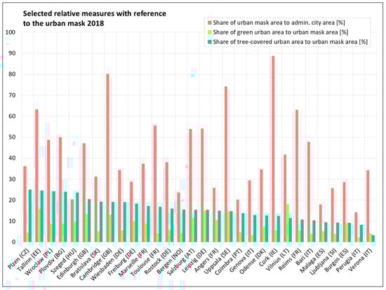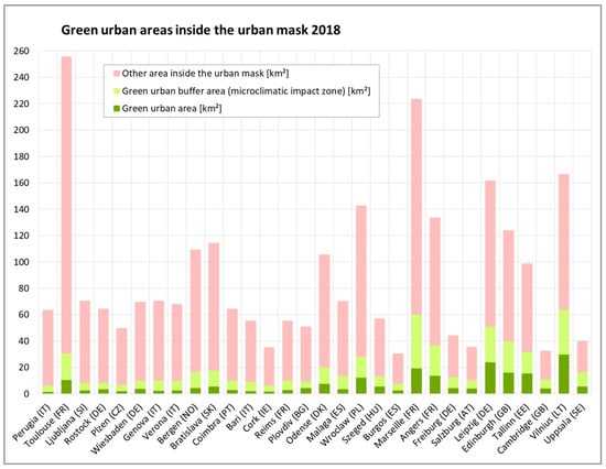 The chart in Figure 6 shows green urban areas and buffers of their potential microclimatic impact zones inside the urban mask of the case study cities 2018, arranged in ascending order according to the areal share of both green categories inside the urban mask. As absolute values are given, the chart reflects the different sizes of the case study cities (measured with their urban mask). As can be seen, the share of public urban green space (with or without a buffer zone) does not depend on the size of the city.
