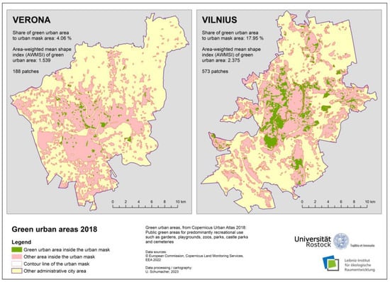 To better understand the quality of urban green infrastructure of a city as a whole or in city districts, landscape metrics can be used as structural indices and combined with a morphological spatial pattern analysis. Based on the urban morphology approach, typical spatial patterns of UGSs can be established as a special taxonomy. For example, a study of six historic city centres in Southern Europe identified three main patterns of urban green, namely, fragmented, compact and linear distribution, with corresponding implications for the potential provision of ecosystem services. As can be seen from the published map sections, all the study sites are essentially located within urban core areas, corresponding to the urban mask [17].