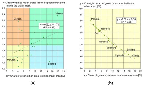 The results of this study are city-wide values for the characterisation of public urban green spaces as well as tree-covered urban green spaces (public or private) with general reference to unified urban masks of 30 selected European cities displaying a wide range of urban structures (Supplementary Materials, Table S1). In addition to simple shared values, two established complex indices were calculated as examples—shape complexity (vector-based) and heterogeneity (raster-based). Furthermore, three population-based metrics were determined. In general, the values of the UGS metrics vary considerably between the individual cities with no clear large-scale relationships initially apparent. Obviously, city-specific factors will strongly influence the urban structures of historically developed cities in Europe. The spatial reference to unified urban masks places the analytical focus of city-wide metrics onto corresponding core areas. In general, no statistically significant correlations between the share of green urban areas (or the share of tree-covered urban areas) to the absolute urban mask area could be found. Of particular interest is the very high correlation between the share value and the contagion index (of both green urban areas and tree-covered urban areas): if this share within the urban mask is known, it already gives an indication of the spatial aggregation of UGS in a city.