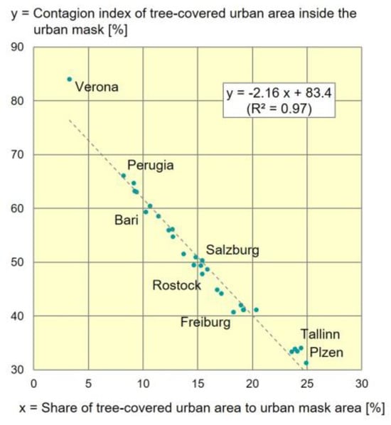 The data analysis includes the calculation of selected metrics of UGSs (green urban areas or tree-covered urban areas) related to the urban mask for each city. In addition, all pairwise correlation coefficients between the selected variables are calculated. The metrics presented here are to be understood as examples. They were selected from the large number of available indices developed as part of the quantitative landscape analysis [36,37,38,39] as well as mathematical methods for urban ecology [40]. In the last-mentioned thesis by Thinh, green spaces within the settlement area (corresponding to an urban mask) are differentiated according to urban structure types and evaluated with suitable measurement variables.
