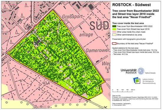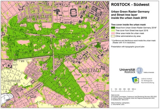 Detailed map of the tree cover from the Baumkataster Rostock 2022 and the European Street Tree Layer (STL) inside the urban mask 2018 in Rostock—Südwest (own processing).