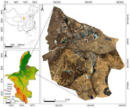The Ningdong coal power base belongs to the Ningxia Hui autonomous region. It is located on the east bank of the Yellow River [18]. It extends from 106.42° to 106.85° E and from 37.91° to 38.30° N. The key core area is 1000.42 km2, as shown in Figure 1.