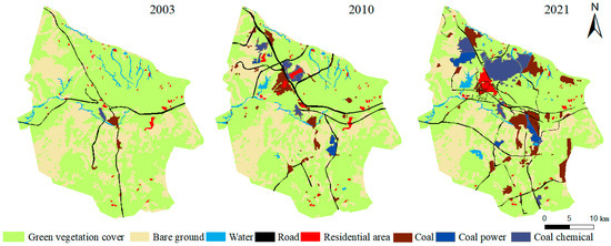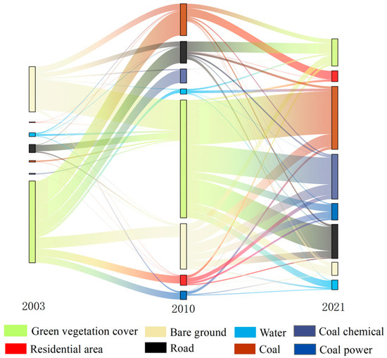 During the period from 2003 to 2010, there was a decrease in green vegetation cover and bare land by 32.07 km2 and 25.07 km2, respectively. Additionally, the areas of coal, roads, the coal chemical industry, coal power generation, residential catchments, and water decreased by 23.55 km2, 10.60 km2, 10.19 km2, 6.49 km2, 6.10 km2, and 0.21 km2, respectively. During the period from 2010 to 2021, the green vegetation cover and bare land decreased by 71.21 km2 and 24.83 km2, respectively. Similarly, the areas of coal, the coal chemical industry, roads, coal power generation, water, and residential catchments decreased by 35.21 km2, 34.83 km2, 12.55 km2, 9.52 km2, 3.47 km2, and 0.45 km2, respectively.